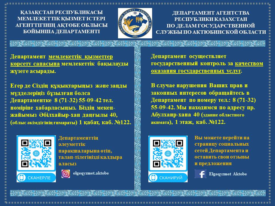 Егер де Сіздің құқықтарыңыз және заңды мүдделерінің бұзылған болса Департаментке 8/7132/ 550942 тел нөміріне хабарласыңыз. Мекен-жайы: Әбілқайыр хан даңғылы 40 каб 122.