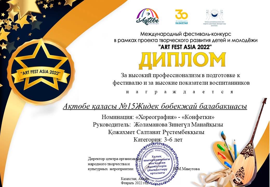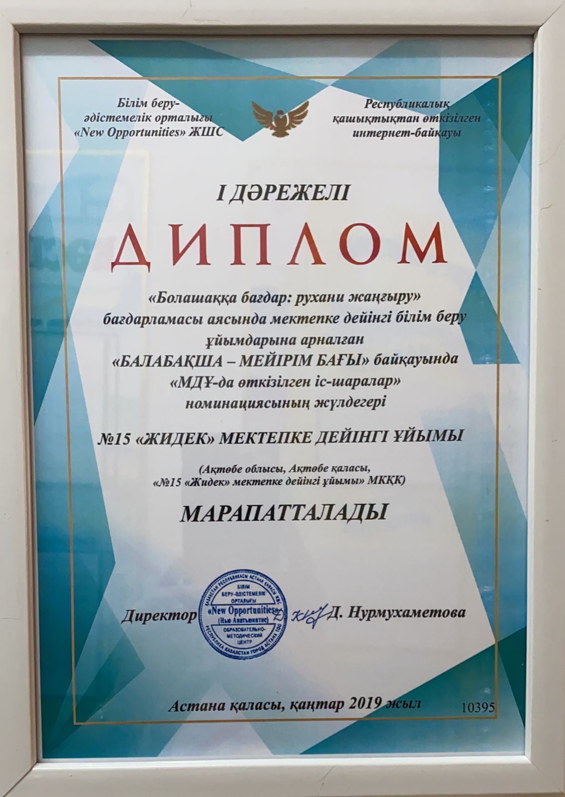 Ұстаздар күні қарсаңында 15 “Жидек” бөбекжай балабақшасының меңгерушісі Иманова Гүлсая Қартбайқызы Қазақстан Республикасы Ақтөбе қаласы Алматы ауданы әкімдігінің Алғыс хатымен марапатталды.