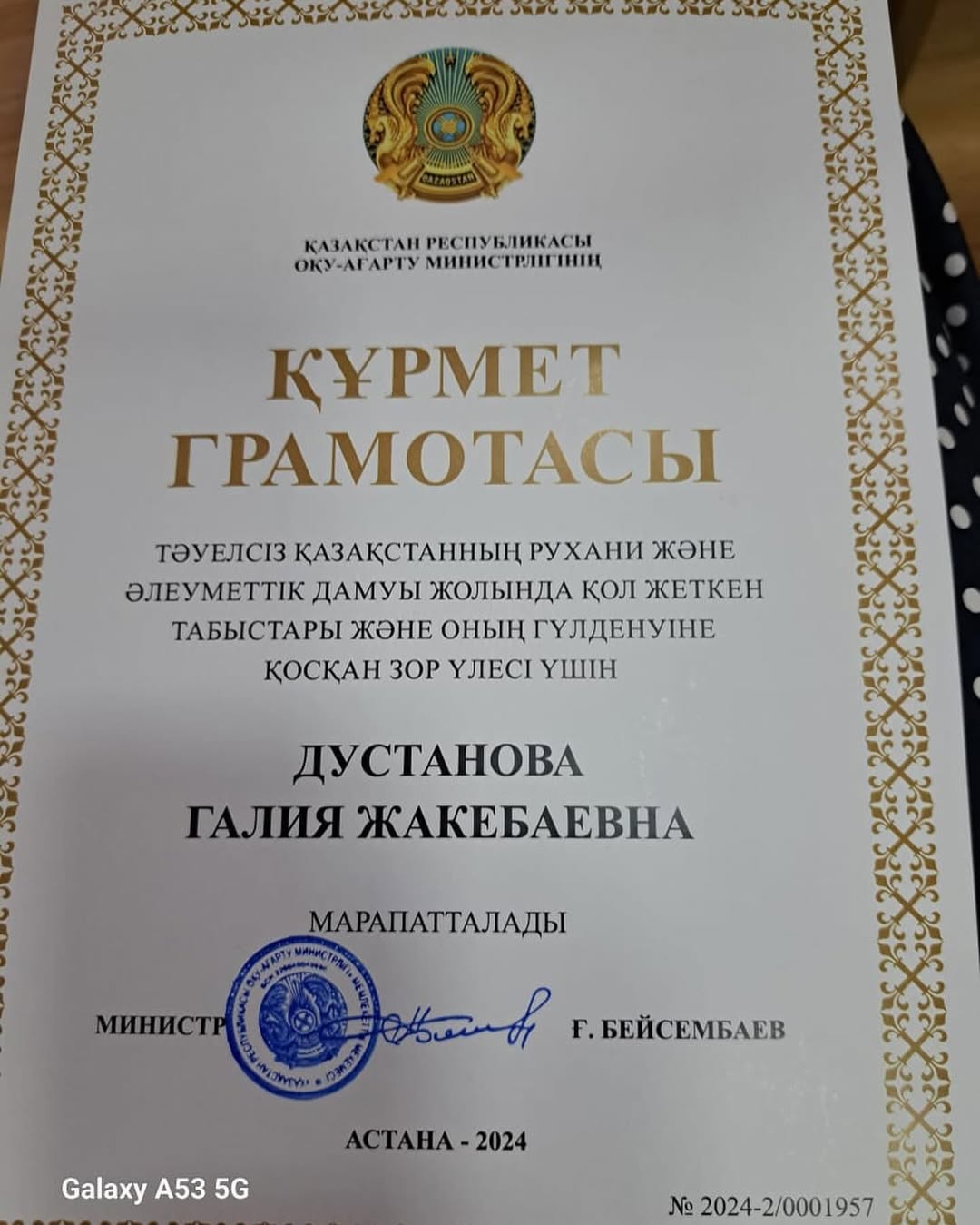 Ұстаздар күні қарсаңында балабақшамыздың тәрбиешісі Дустанова Галия Жакебаевна Қазақстан Республикасы оқу - ағарту министрлігінің Құрмет грамотасымен марапатталды.