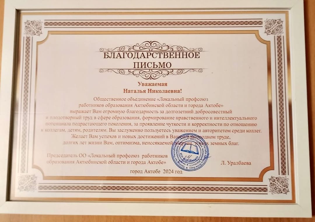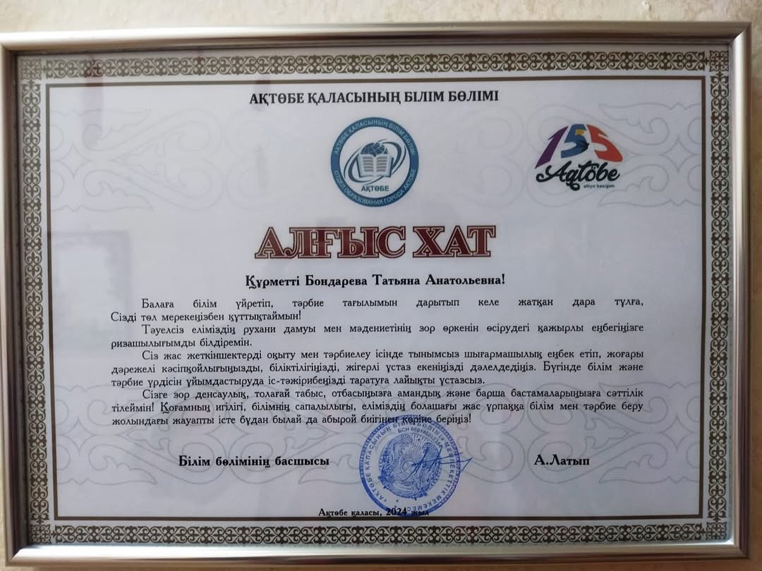 Ұстаздар күні қарсаңында Бондарева Татьяна Анатольевна Ақтөбе қаласы білім бөлімінің Алғыс хатымен марапатталды!