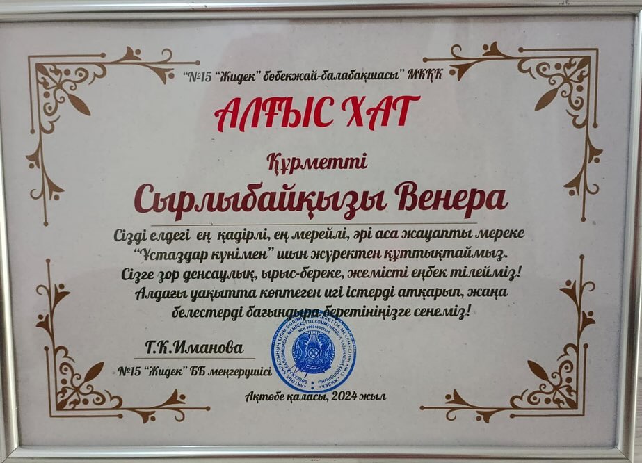 Ұстаздар күні қарсаңында бақшамыздың тәрбиешісі Сырлыбайқызы Венера 15 ”Жидек” бөбекжай балабақшасы МКҚК Алғыс хатымен марапатталды!