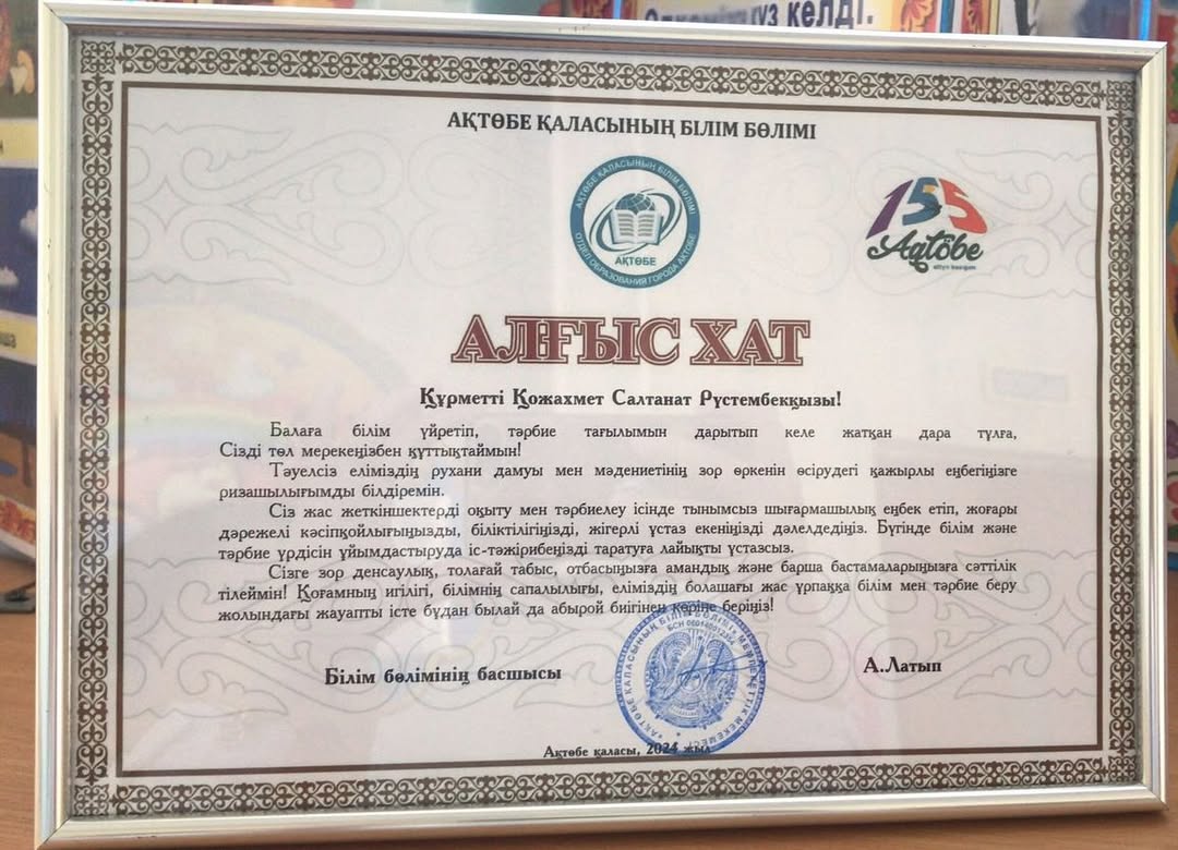Ұстаздар күні қарсаңында балабақшамыздың тәрбиешісі Қожахмет Салтанат Рүстембекқызы Ақтөбе қаласы білім бөлімінің Алғыс хатымен марапатталды!