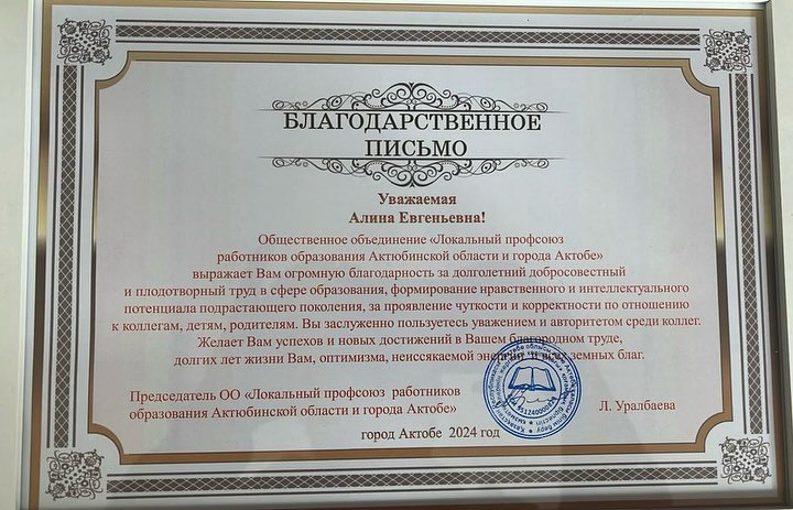 Ұстаздар күні қарсаңында бақшамыздың тәрбиешісі Алина Евгеньевна Ақтөбе қаласы Білім бөлімі Кәсіподақ ұйымының Алғыс хатымен марапатталды!