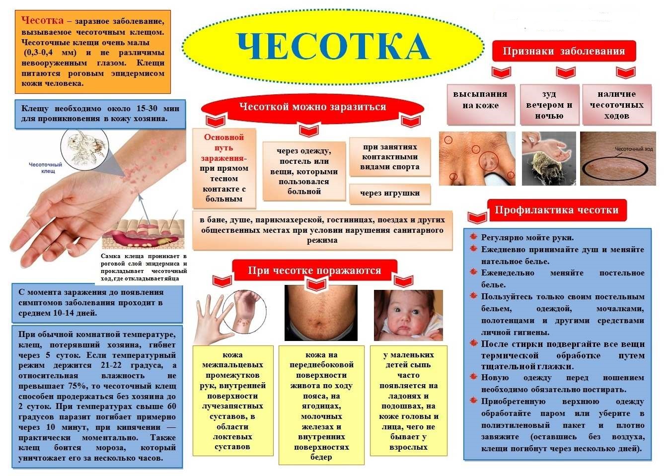 Таким образом, клещ выходит на поверхность два раза за свой жизненный цикл. Для того чтобы внедриться под кожу чесоточному клещу достаточно 15-20 минут, этим и объясняется контагиозность чесотки. Первую половину дня самка откладывает яйца, а в ночное время прогрызает ходы, жизненный цикл возбудителя чесотки составляет от двух недель до двух месяцев, после чего клещ погибает и разлагается в прогрызенных ходах. Клещ чесотки не стоек и при температуре +55 градусов погибает через 10 минут, а при температуре +80 погибает мгновенно. Вне человека клещ так же довольно быстро погибает.