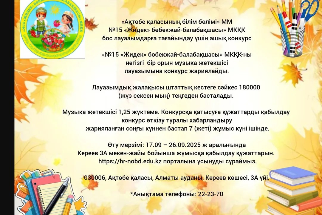 На основании «Правил назначения на должность, освобождения от должностей первых руководителей и педагогов государственных организаций образования», утвержденных приказом Министра образования и науки РК №57 от 21.02.2012 года Государственное коммунальное казенное предприятие «Ясли- сад №15 «Жидек» проводит конкурс на занятие вакантной должности дефектолога с русскис языком обучения, музыкального руководителя с русским языком обучения.