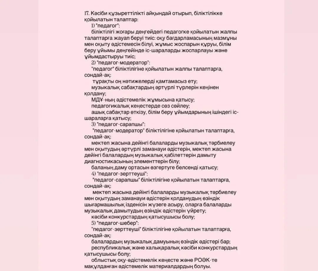 Должен знать: Конституцию Республики Казахстан, Трудовой Кодекс Республики Казахстан, законы Республики Казахстан "Об образовании", "О статусе педагога", "О противодействии коррупции" и другие нормативные правовые акты Республики Казахстан, определяющие направления и перспективы развития образования; психологию и педагогику, правила оказания первой доврачебной медицинской помощи, правила по безопасности и охране труда, санитарные правила; нормативно - правовые документы по организации дошкольного воспитания и обучения.